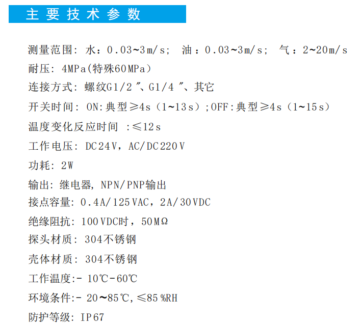 ●适用于管道内流体流速大小、断流的监测,防止泵的空转