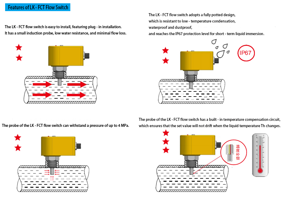 The LK - FCT thermal conductivity flow switch is designed based on the principle of heat exchange. The probe has a built-in heating module and a heat - sensitive module. The heat conduction of the flow switch is closely related to the flow velocity of the medium. During measurement, heat is emitted by the heating module. If there is no medium flowing in the pipeline, the heat received by the heat - sensitive module is a fixed value; when there is medium flowing, the heat received by the heat - sensitive module will change with the change of the flow velocity of the medium. The heat - sensitive module converts this temperature difference signal into an electrical signal, and then the processor converts it into a corresponding standard analog quantity signal or contact signal for output. The flow switch displays and controls the flow velocity of the medium through this signal. |